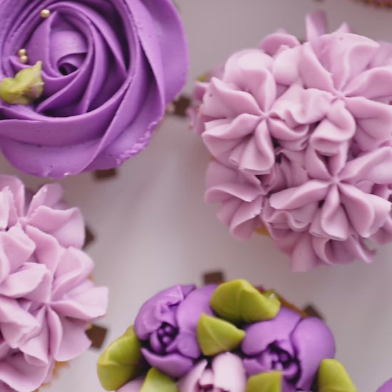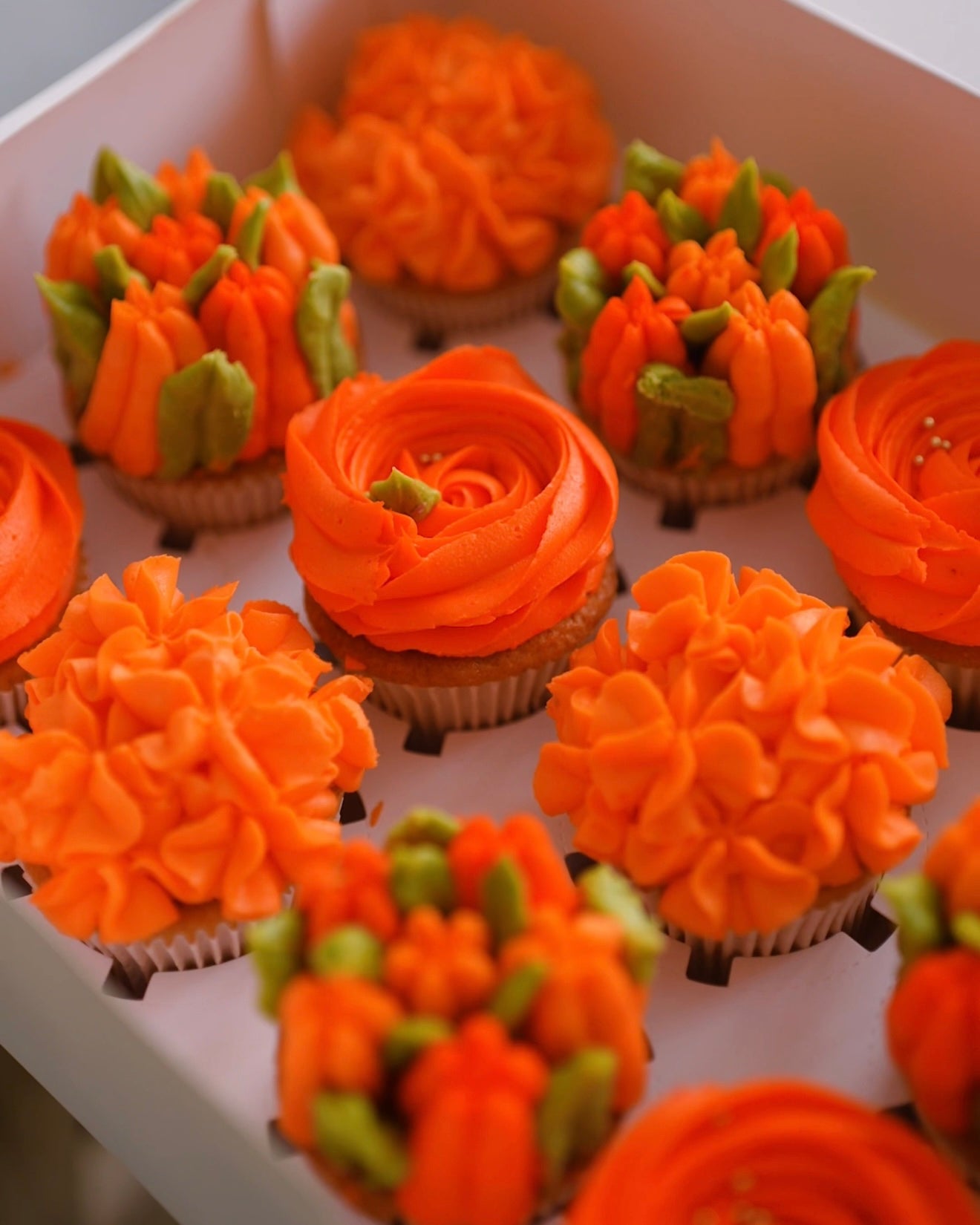 A dazzling box of vibrant orange floral cupcakes, inspired by glowing sunsets and fiery blossoms. Featuring buttercream roses, tulips, and ruffled blooms, this bold and radiant box is perfect for birthdays, celebrations, or any moment that deserves a warm, unforgettable touch.
